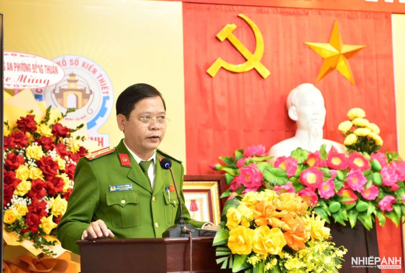 Đồng chí Thượng tá Hà Đức Cường, Bí thư Đảng ủy, Trưởng Công an phường Đồng Thuận phát biểu tại buổi lễ
