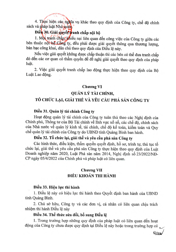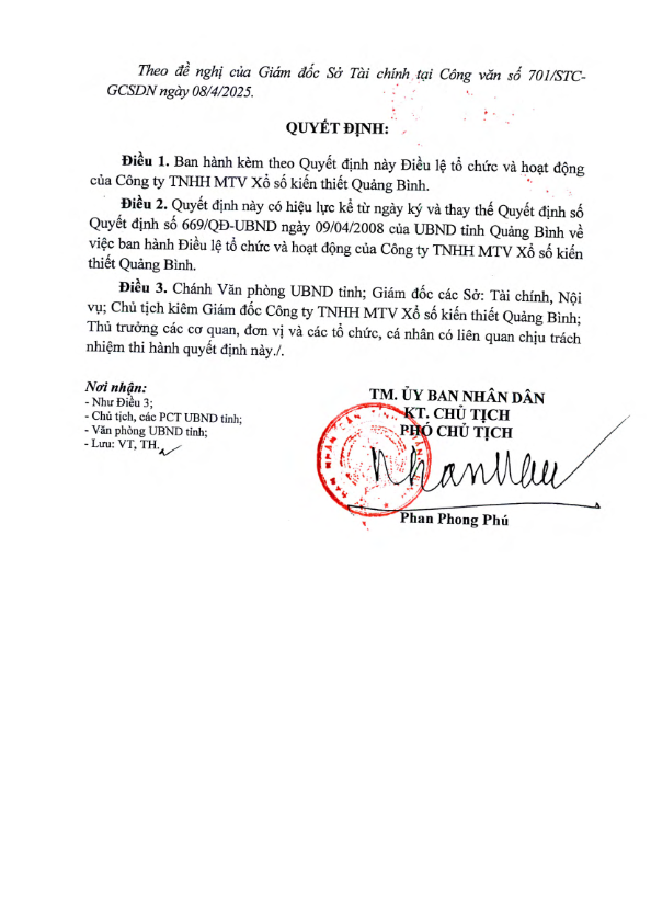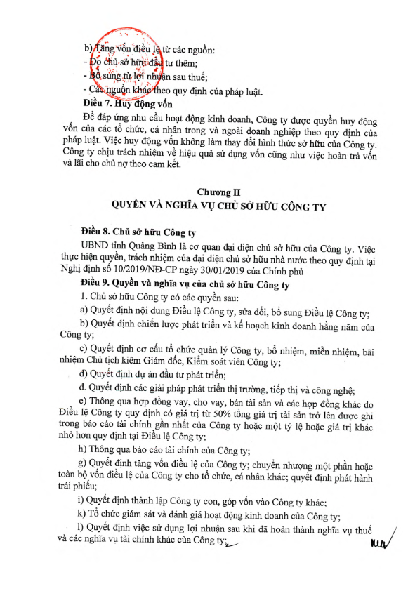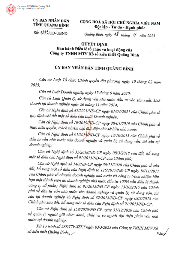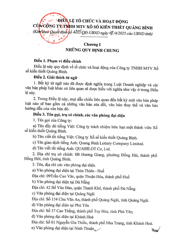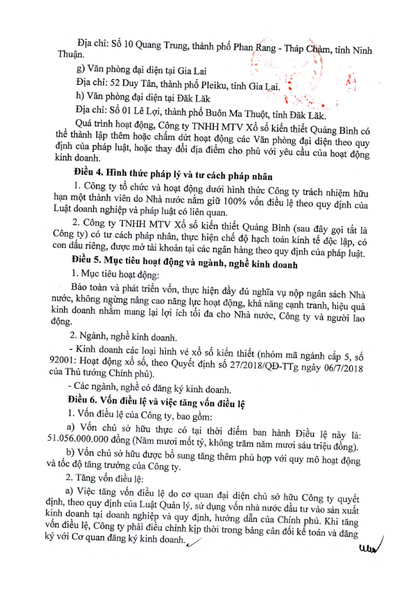 Điều Lệ tổ chức và hoạt động của Công ty TNHH MTV Xổ số kiến thiết Quảng Bình